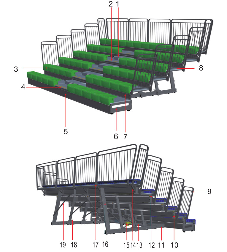 | 1.踏步 2.踏板 3.座椅 4.前沿板 5.前挡板 6.弹性首排支撑 |