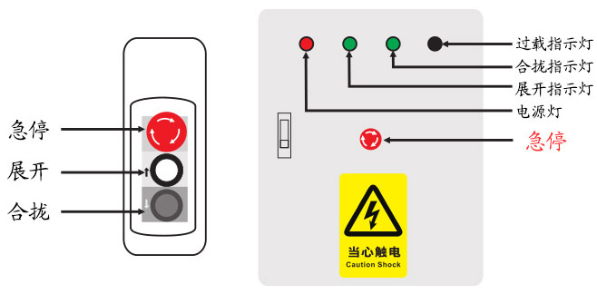 注:手柄开关使用方法为点动。长按合拢按钮即可合拢,当看台彻底合拢时,触碰到限位开关会自动停止。